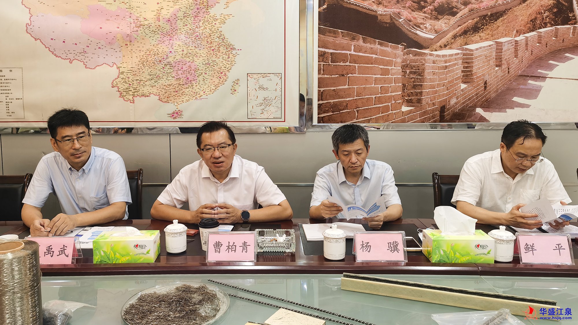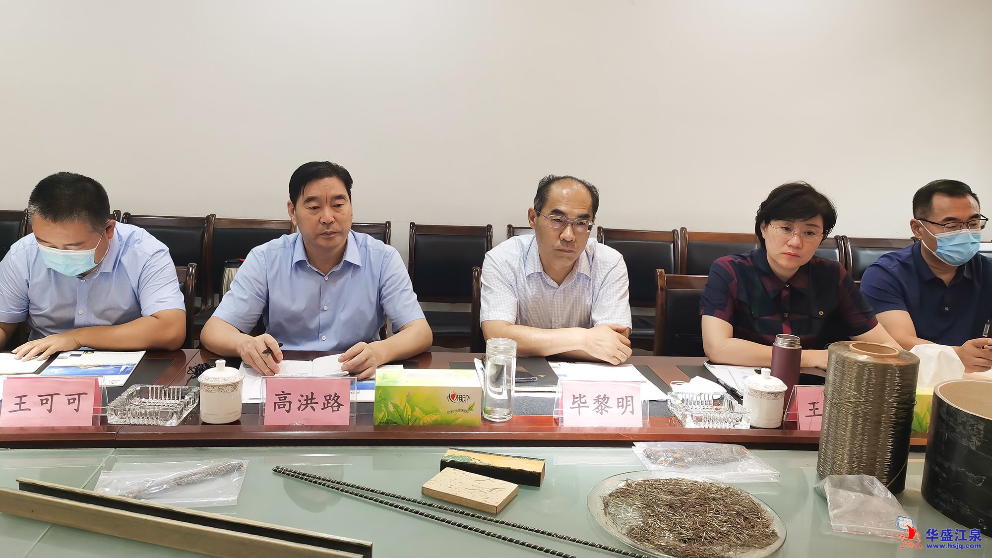 臨沂市人民政府辦公室秘書五科科長王可可、副科長梅波,臨沂市工信局材料產業科工程師劉昊霖,羅莊區投資促進服務中心主任梁洪斌,羅莊區委辦公室主任科員劉愛明,中國國機重工集團有限公司礦山事業部經理葛小榮,華盛江泉集團辦公室相關人員共同參加考察活動。